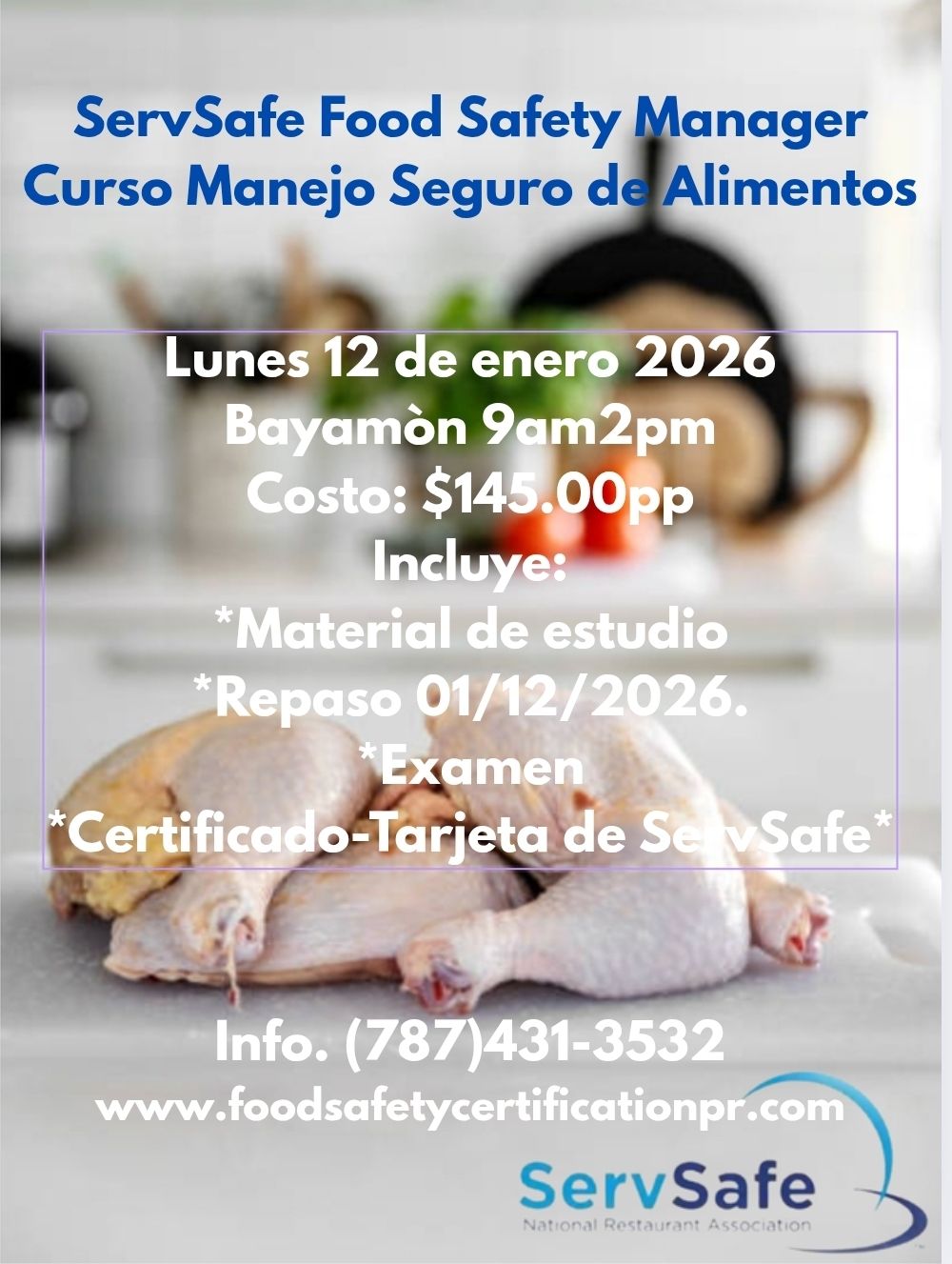 Información y separar tu espacio (787)431-3532 o envíanos un correo electrónico a foodsafetycertificationpr@gmail.com