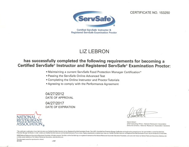 Certified ServSafe Instructor and Registered ServSafe Examination Proctor for NRA